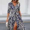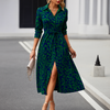 Add elegance to your everyday wardrobe with this printed A-line shirt dress — a perfect fusion of vacation ease and commuter style. Crafted from soft, slightly stretchy jersey fabric, this dress features a turn-down collar, short sleeves, and a natural waistline that flows into a flattering A-line silhouette. The front slit adds a modern touch, while the printed design keeps your look fresh and stylish.