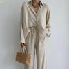 Step into the new season with effortless elegance in this trendy two-piece set. Combining a loose, long-sleeved blouse with straight-leg pants, it offers a refined yet relaxed look suitable for both office wear and comfortable outings.