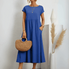 With its classic O-neckline, short sleeves, and natural waistline, this pullover dress blends timeless style with comfortable ease — perfect for vacations, weekend outings, or simply enjoying warm sunny days. The solid color design and subtle shirring details make it easy to dress up or down depending on the occasion.