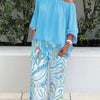 The Angelique set is the epitome of effortless elegance, perfect for warm days and chic outings. Featuring a breezy off-shoulder top with wide lantern sleeves and a matching wide-leg pant adorned with a retro abstract print, this ensemble offers both comfort and style.
